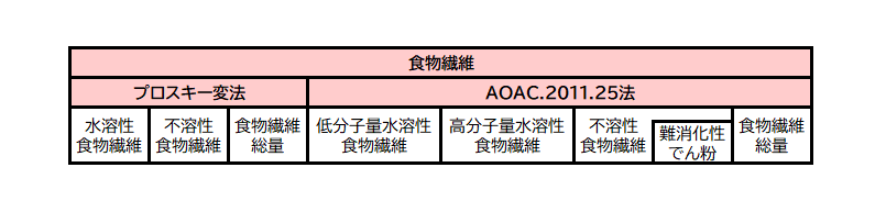 2つの方法による値の違いについて、AOAC 2011.25法は、従来法では定量できなかった低分子量水溶性食物繊維が定量できるため、より真値に近いとされています。そのため、食品成分表では従来法の値を新しい方法の値へ順次置き換える取り組みが進められています。
