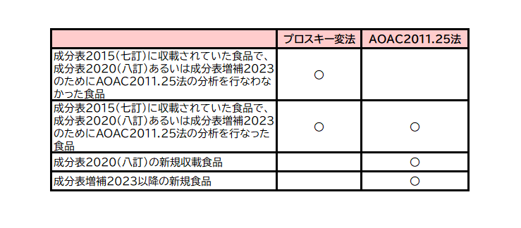 - 従来の方法(プロスキー変法)でのみ分析されている食品