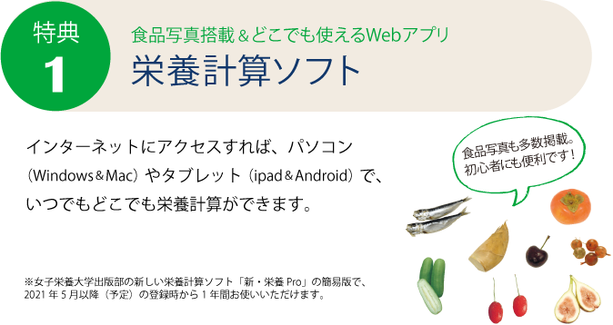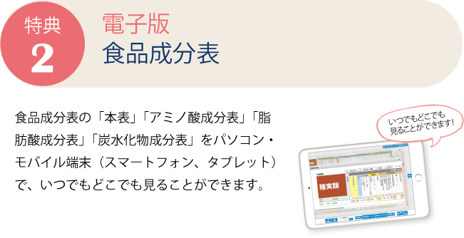 ・食品成分表の本表、アミノ酸成分表、脂肪酸成分表、炭水化物成分表をパソコン・タブレットで、いつでもどこでも見ることができます。電子版はすべてカラー版で見やすい!