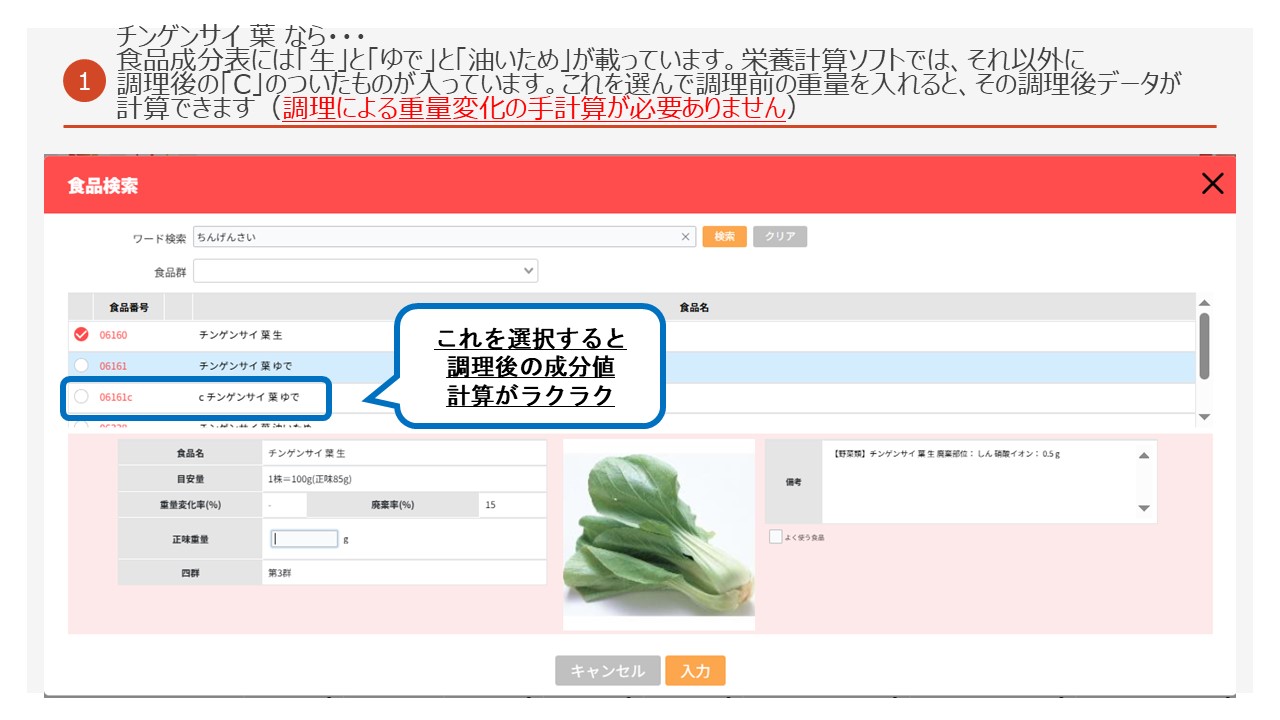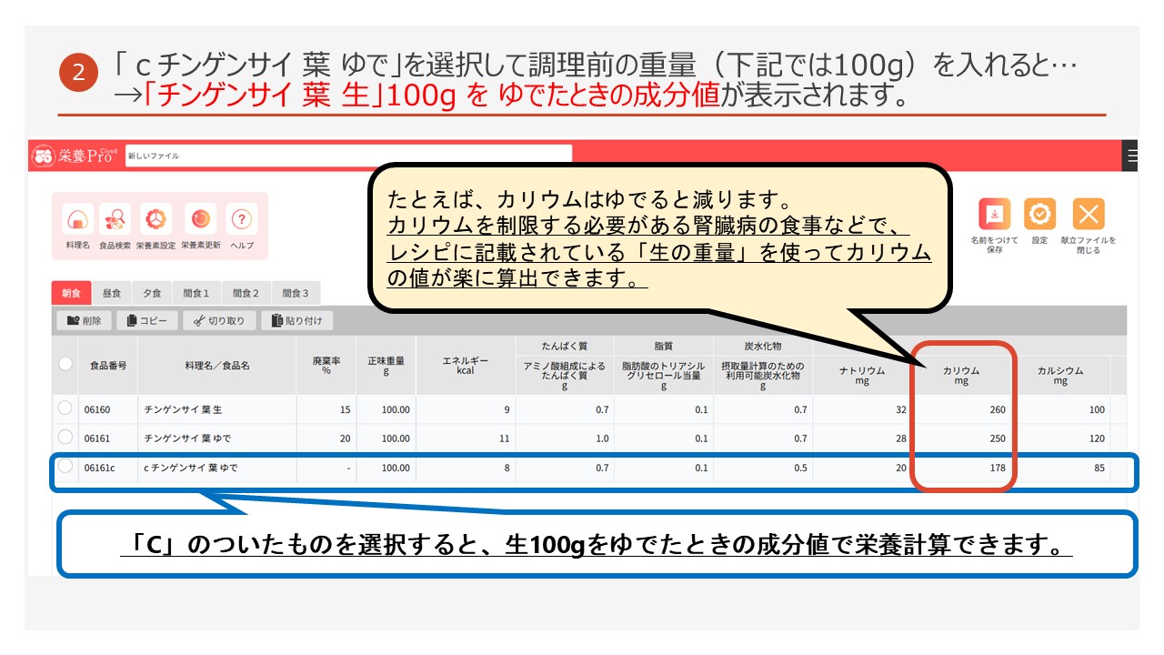 ・生の食材の重量で調理後のデータに変換する食品項目(Cのついているもの)を搭載! 調理後データの計算もこれでらくらく!