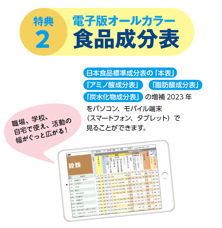 特典②  電子版食品成分表 本表のほか、アミノ酸、脂肪酸、炭水化物の成分表もカラーで見やすい!
