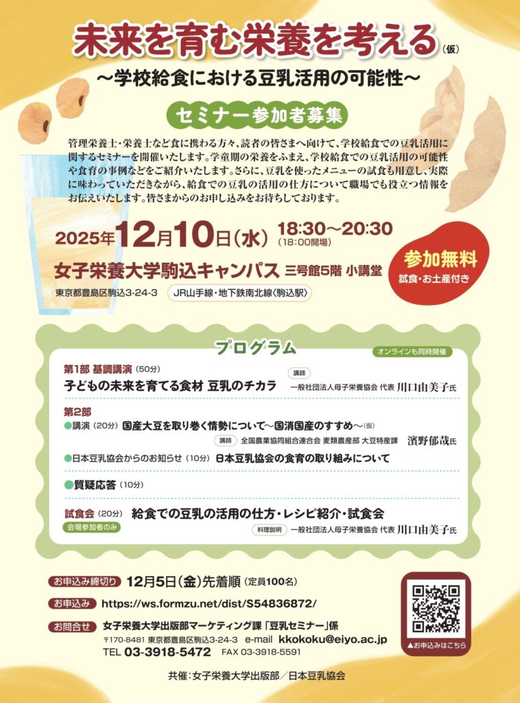 管理栄養士・栄養士など食に携わる方々、読者の皆さまへ向けて、学校給食での豆乳活用に関するセミナーを開催いたします。学童期の栄養をふまえ、学校給食での豆乳活用の可能性や食育の事例などをご紹介いたします。さらに、豆乳を使ったメニューの試食も用意し、実際に味わっていただきながら、給食での豆乳の活用の仕方について職場でも役立つ情報をお伝えいたします。皆さまからのお申し込みをお待ちしております。